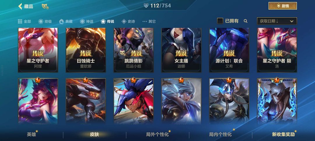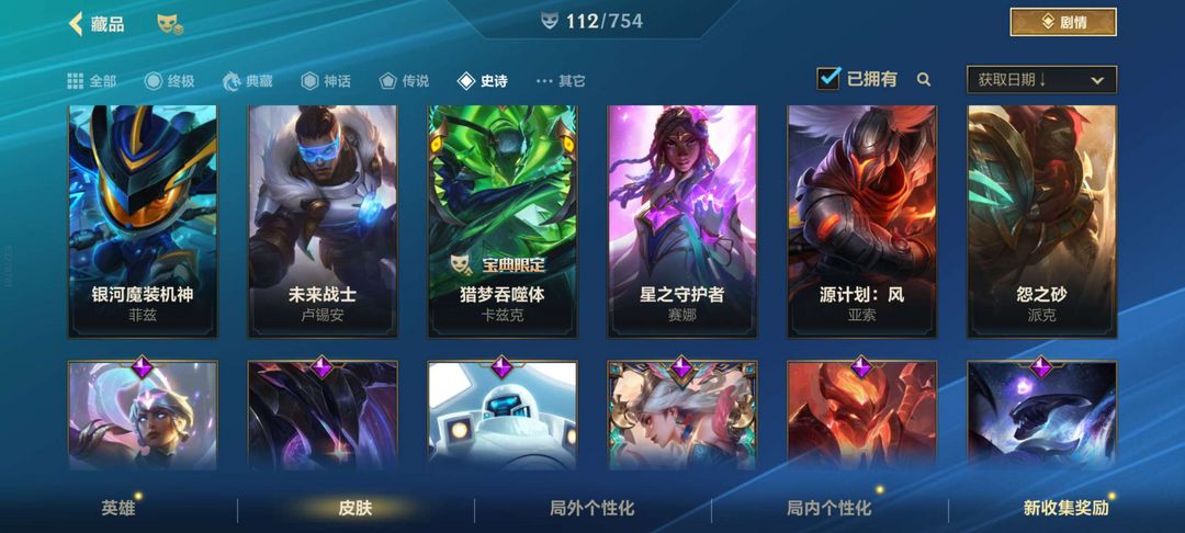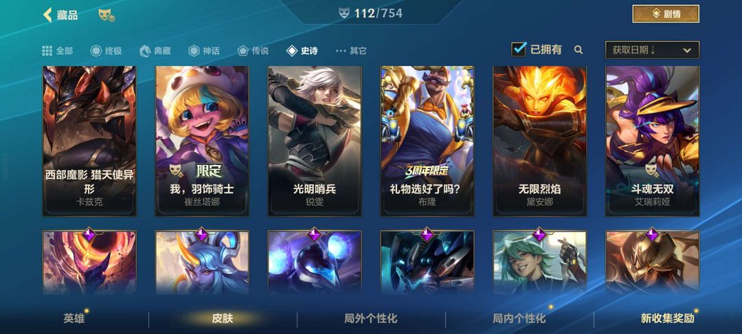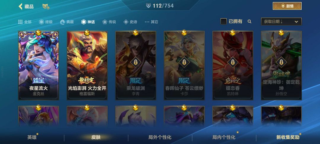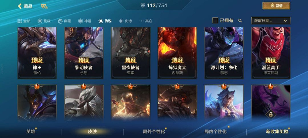 装备描述:螳螂全皮,还有剑圣斩星魔剑,两个神话皮,23传说皮,53史诗皮,可排位