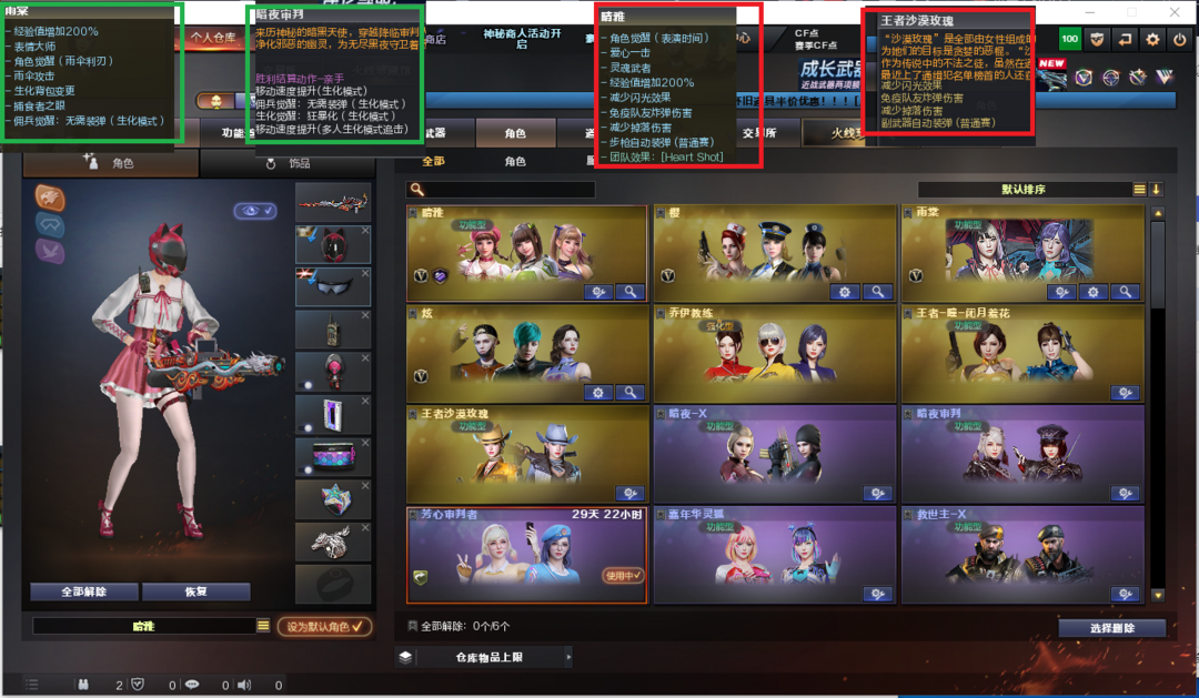 装备描述:排位:可以、、、、、、、、、、、爆破四防:幻神、USP神工天巧、QBZ金色蔷薇、王者蔷薇、炽芒蝶刃、、、蔷薇音效、、、生化人物(雨棠、暗夜审判)爆破四防(晴雅、王者沙漠玫瑰)
