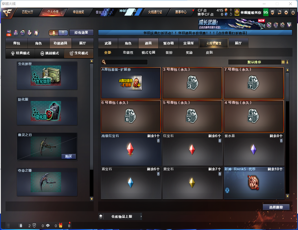 幻影猎人✨13生化皮肤✨斯泰尔蝴蝶小毒蜂✨生化6盘6烈✨四防生化背包✨幻神宙斯满榴弹不退包无炽芒蝶刃
