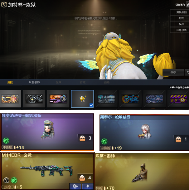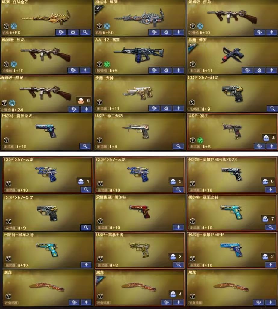 装备描述:神威天绫、神威莲华、传说影煞、传说星骇、传说圣谕、幻神Kz、EP世冠全套、白鲨世冠、欧欧、AGS24、AGS17、星火小队、动感、丹凤、幻神音效卡;幻影,加利尔ACE-天袭,白虎5皮、白虎音效、星神6皮、星神音效,王者星霆,M200-经济荣光,裁决5皮、裁决音效卡、冠军之特*2、白鲨柯尔特、荣耀世冠、荣光柯尔特、EP柯尔特、冥王USP,王者雷暴USP、神功天巧USP、云龙COP*2、妮妮、鹰、隼、云悠悠、关小羽,星际战将,炽芒蝶刃*3、COP幻灵*2