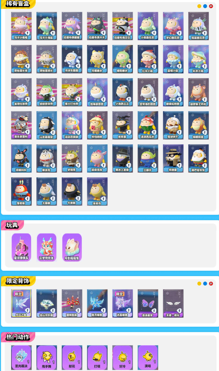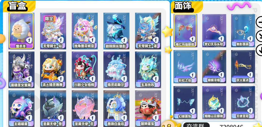 装备描述:安卓官服 14W潮流值 18至臻角色盲盒 80典藏盲盒角色 云梦兜兜龙 月影摇摇兔(兔兔车)星河弹弹车 炫光舞台 月白之隐 至臻角色:醒狮蛋宝 天穹骑士-钻(限定染色) 独角兽芬妮亚 主唱曜星 玉龙扶风 天穹骑士-湛 圣翼天使-恋 剧院院长魅影 圣翼天使-堕 精灵莉斯尔 川剧少女梧桐 苗疆圣女蚩离 流火精灵舞舞 蔷薇白皇后 稀有盲盒角色:小国王蕾利 歌院首席露希 灵灯闪闪 水母莱莱 小羊 圆圆子 红小豆 飞天小猪班尼 等各种