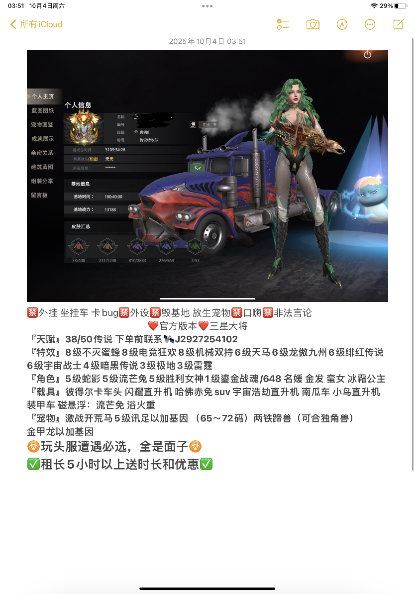 ✅安卓苹果互通✅玩头服必备号✅满级开荒特效枪✅满级飞行角色✅满级天赋✅基因开荒马✅