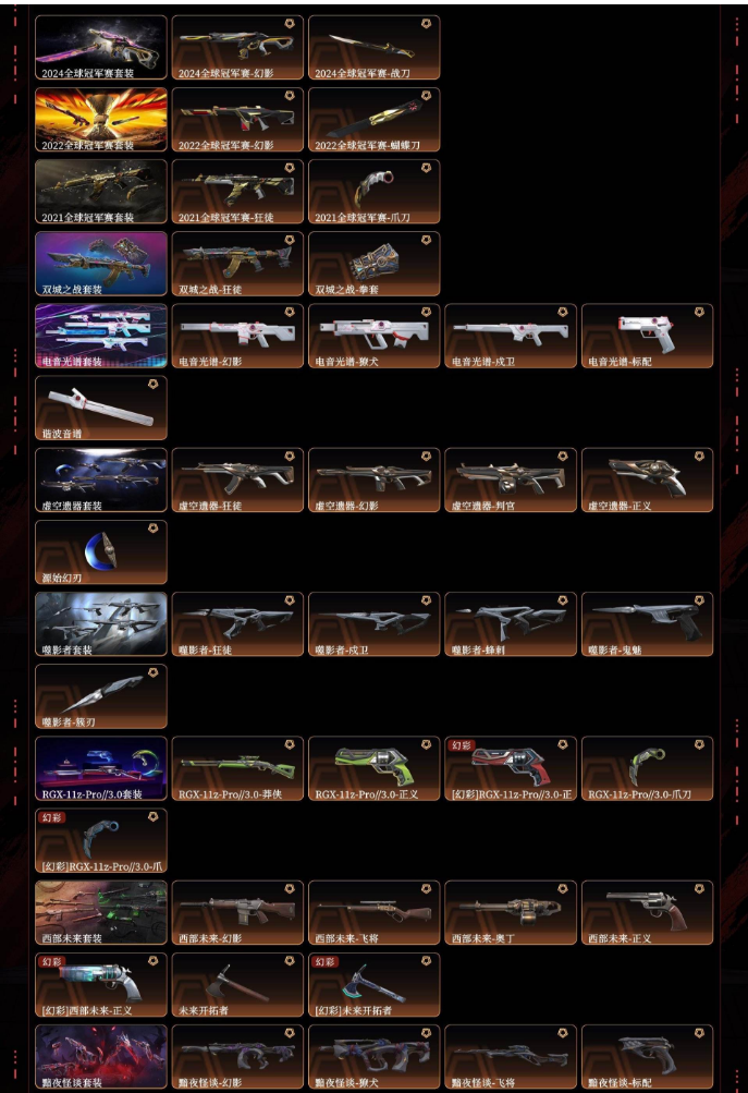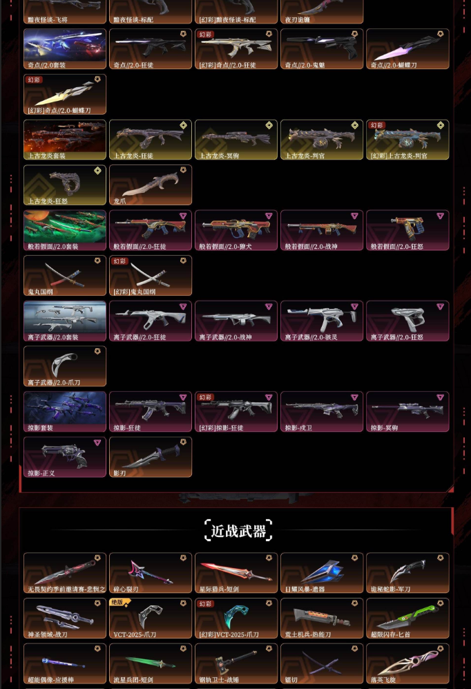 装备描述:悲悯之刃西部未来电音光谱双城之战21全球22全球24全球虚空遗器噬影者显卡3.0黯夜怪谈奇点2.0上古龙炎般若假面2.0离子武器2.0掠影vct爪刀超限闪存匕首落英飞旋黑波之刃紫金爪刀剥皮小刀侦察力量蝴蝶刀威龙之刃光荣异象狂徒显卡狂徒光明哨兵狂徒混沌序曲狂徒千灵华绽幻影洪荒怒焰幻影洪荒怒焰狂徒破败军械幻影塑水宗狂徒全息波普2.0狂徒归零者撩犬协议幻影艾莉沃的梦之翼狂徒源能者娱乐系统幻影堕天遗武狂徒紫阙金琅狂徒盖亚的复仇狂徒侦察力量幻影耀鳞威龙狂徒混沌序曲冥驹塑水宗飞将偃月苍龙冥驹堕天遗武冥驹紫阙金琅奥丁天界神兵蜂刺天界神兵2.0判官vctedg标配混沌序曲短炮千灵华绽正义塑水宗正义奇点正义艾莉沃的梦之翼鬼魅天界神兵鬼魅紫阙金琅标配
