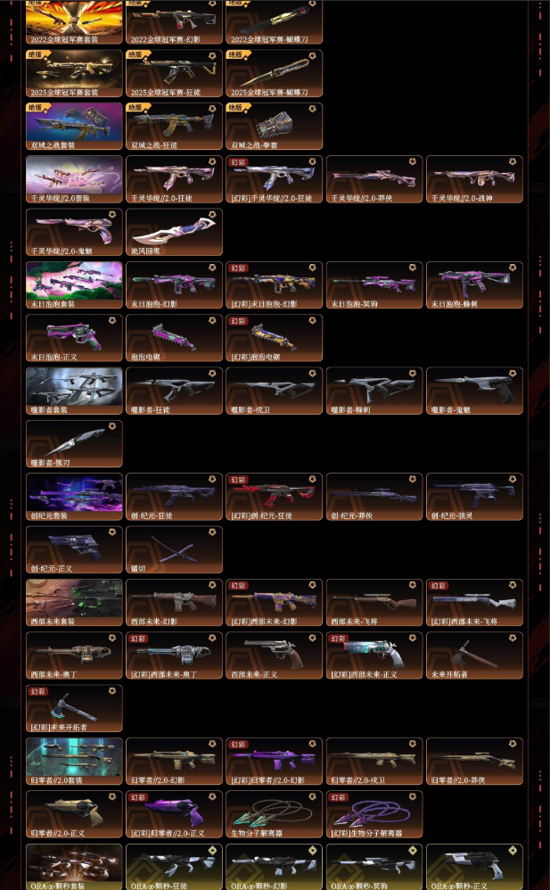 装备描述:悲悯之刃千灵华绽2.0颗秒22冠军25冠军双城之战末日泡泡噬影者创纪元西部未来归零者2.0超时空卫队掠影2.0神中神罚朋克3.0苍龙之刃vct爪刀显卡2.0蝴蝶刀影刃多弥尔的复仇狂徒显卡狂徒混沌序曲2.0幻影虚空遗器狂徒混沌序曲狂徒千灵华绽幻影黯夜怪谈撩犬黯夜怪谈幻影洪荒怒焰狂徒洪荒怒焰幻影塑水宗狂徒光明哨兵2.0幻影上古龙炎狂徒艾莉沃的梦之翼狂徒离子武器2.0狂徒海洋之星2.0幻影异鳞魔蛇幻影堕天遗武狂徒金角生辉幻影盖世英雄狂徒紫阙金琅狂徒盖亚的复仇2.0狂徒侦察力量幻影耀鳞威龙狂徒掠影狂徒光明哨兵冥驹偃月苍龙冥驹上古龙炎冥驹奇点战神千灵华绽判官起源雄鹿lev标配电音光谱标配黯夜怪谈标配洪荒怒焰短炮全息波普2.0标配奇点正义天界神兵鬼魅无限星环标配