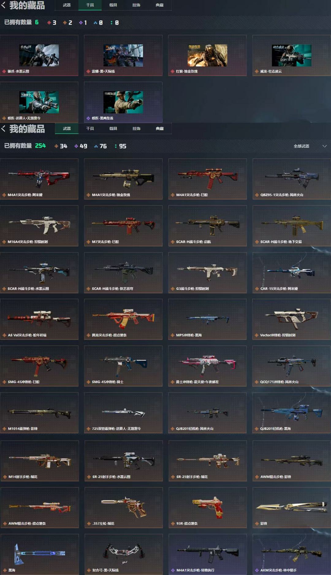 装备描述:红狼-蚀金玫瑰 骇爪-水墨云图 露娜-黑·天际线 威龙-壮志凌云 蜂医-送葬人·无题密令 蜂医-黑鹰坠落 影锋 黑海 黑鹰