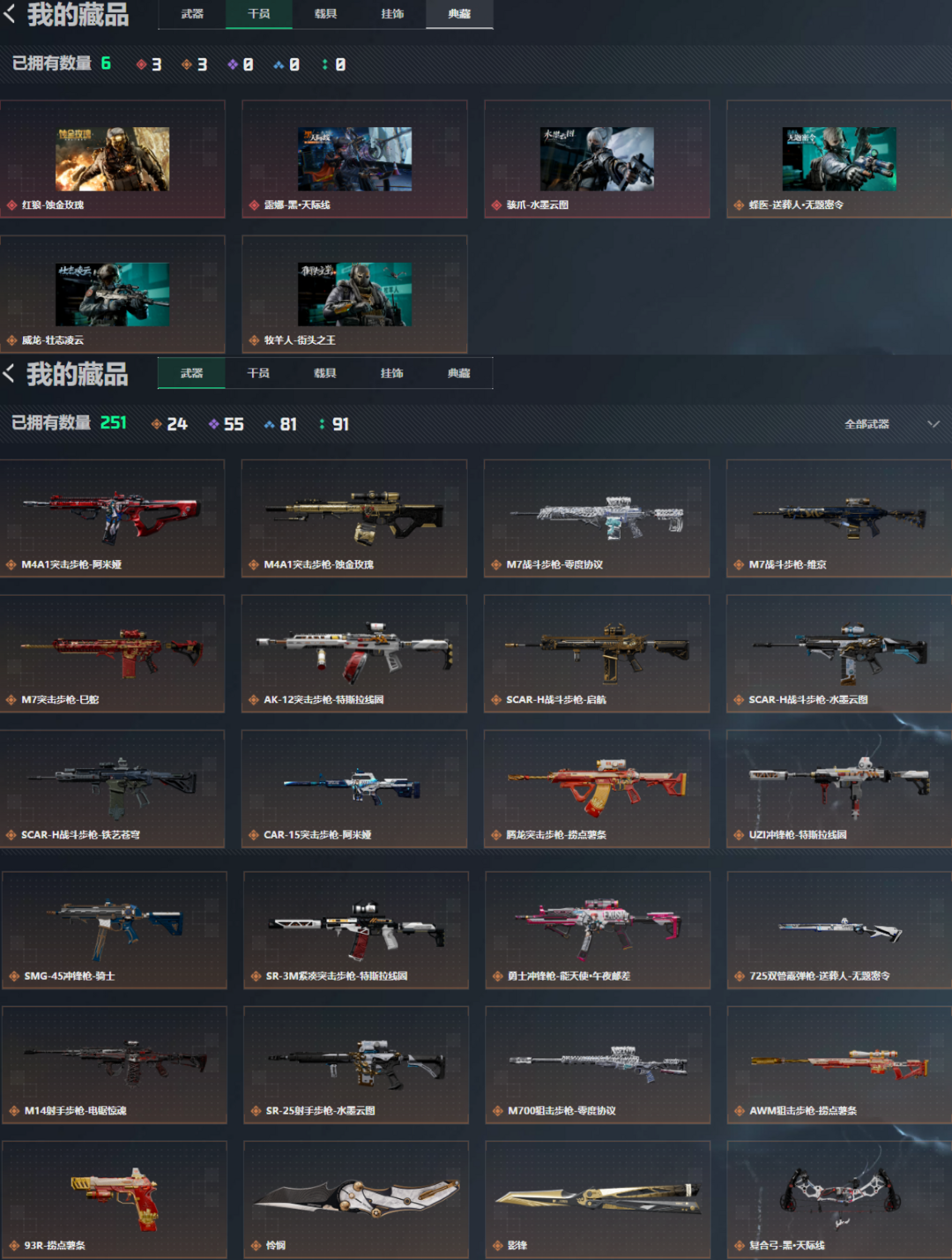 装备描述:3红双刀 27金皮❤️露娜 黑-天际线❤️怜悯❤️蝴蝶刀❤️水墨云图麦晓雯