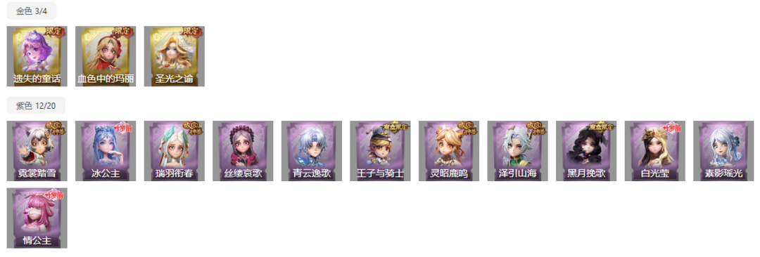 限制: 租号20次及以上 |装备描述:【金色皮肤】圣光之谕、血色中的玛丽、遗失的童话 【紫色皮肤】素影瑶光、灵昭鹿鸣、王子与骑士、白光莹、黑月挽歌、青云逸歌、泽引山海、冰公主、丝缕哀歌、瑞羽衔春、霓裳踏雪、情公主 【道具皮肤】小鲨匕首、圣心之泪、龙鳞、永眠曲、最后的独角兽、小狗蛇点点鞭、幻宠之门、祝祷词、花落精绝、宝剑八、星光的裁决、云端梦想计划、飞花令、乘风溯雪 【头饰】小狗蛇点点头套 【背饰】天使的呼唤、云梦之星、在逃小新娘、兔先生的时钟 【挂饰】钗头凤、天使消失的年代、小鲨包包、未竟乐园、小小玛丽 【动作】鹏友摇、DL摇、心跳摇、舞台中心、小雨摇、九万字舞、星奇摇、旋转舞、律动迪斯科、骑马舞、山楂树之舞、抬手
