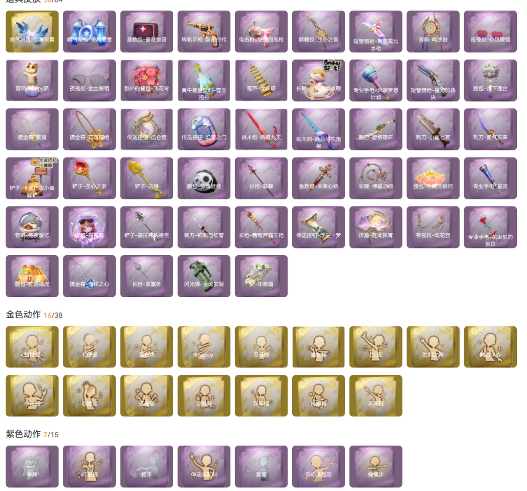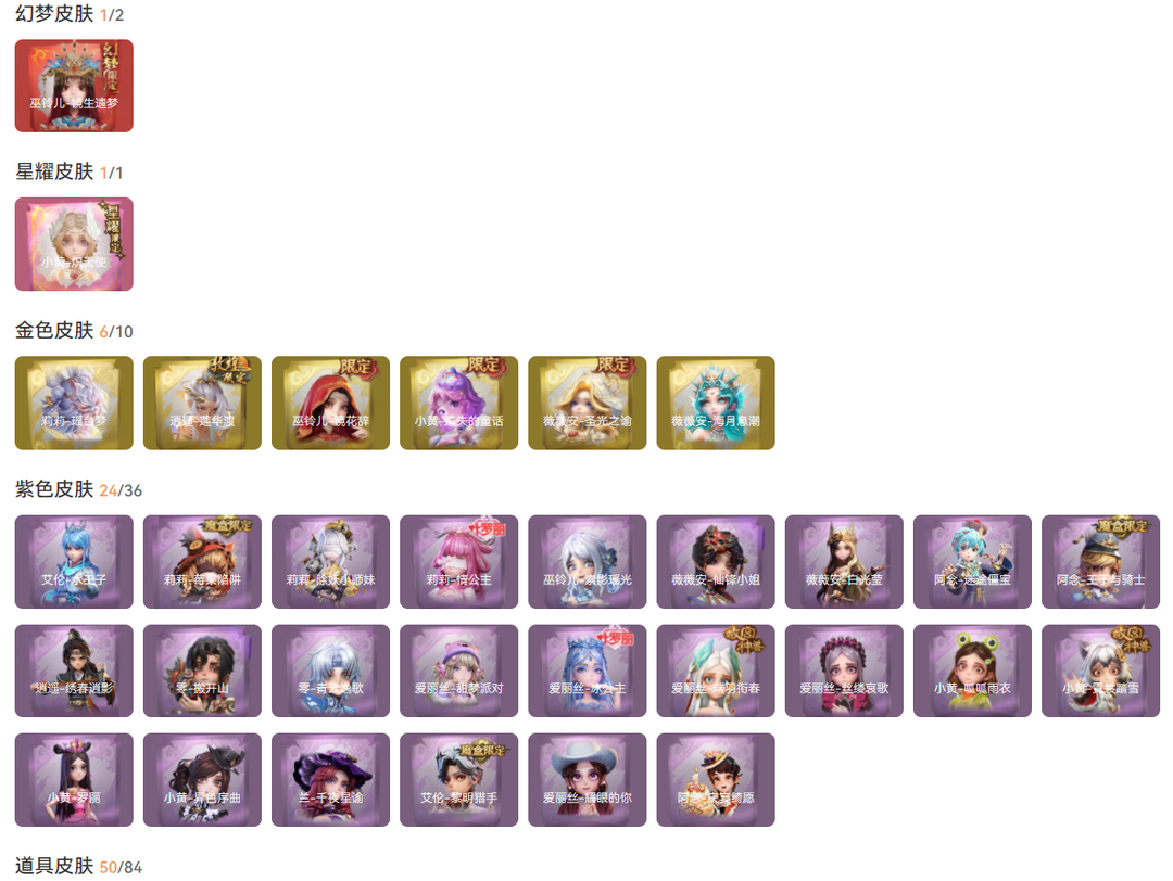 装备描述:红皮1;粉皮1;金皮6;紫皮24;道具皮50;皮肤:小黄-炽天使,巫铃儿-镜生遗梦,小黄-遗失的童话,莉莉-瑶台梦,巫铃儿-镜花辞,逍遥-莲华渡,薇薇安-海月息潮,薇薇安-圣光之谕,阿念-王子与骑士,艾伦-水王子,爱丽丝-瑞羽衔春,巫铃儿-素影瑶光,小黄-罗丽,爱丽丝-甜梦派对,莉莉-除妖小师妹,莉莉-莓果陷阱,小黄-异色序曲,零-搬开山,爱丽丝-丝缕哀歌,爱丽丝-冰公主,莉莉-情公主,薇薇安-白光莹,薇薇安-仙锋小姐,阿念-庆宴绮愿,阿念-迷途僵宝,艾伦-黎明猎手,爱丽丝-耀眼的你,小黄-霓裳踏雪,兰-千夜星谕,零-青云逸歌,小黄-呱呱雨衣,逍遥-绣春逍影;道具:喷气背包-晶澜灵翼,铲子-卡皮巴拉小黄豚铲,夜视仪-金丝眼镜,长鞭-缚誓之锁,腰包-私藏的银河,长枪-罪棘,闪光弹-金戈玄铜,传送按钮-浮生一梦,桃木剑-凤鸣九天,音响-鸣沙鼓,摸金符-海洋之心,急救包-末章心跳,葫芦-伏妖塔,铲子-龙鳞,伞-沐春颂,传送按钮-幻宠之门,音响-happy猫,电击枪-甜蜜泡泡枪,黄牛能量饮料-青玉抱丹,转轮手枪-新星时代,折扇-露露扇,长鞭-小狗蛇点点鞭,折扇-赴此良宵,刺刀-紫气东来,桃木剑