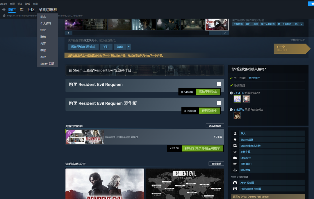 装备描述:《生化危机9:安魂曲-Resident Evil Requiem》-终极版!全DLC豪华版全部已入steam库