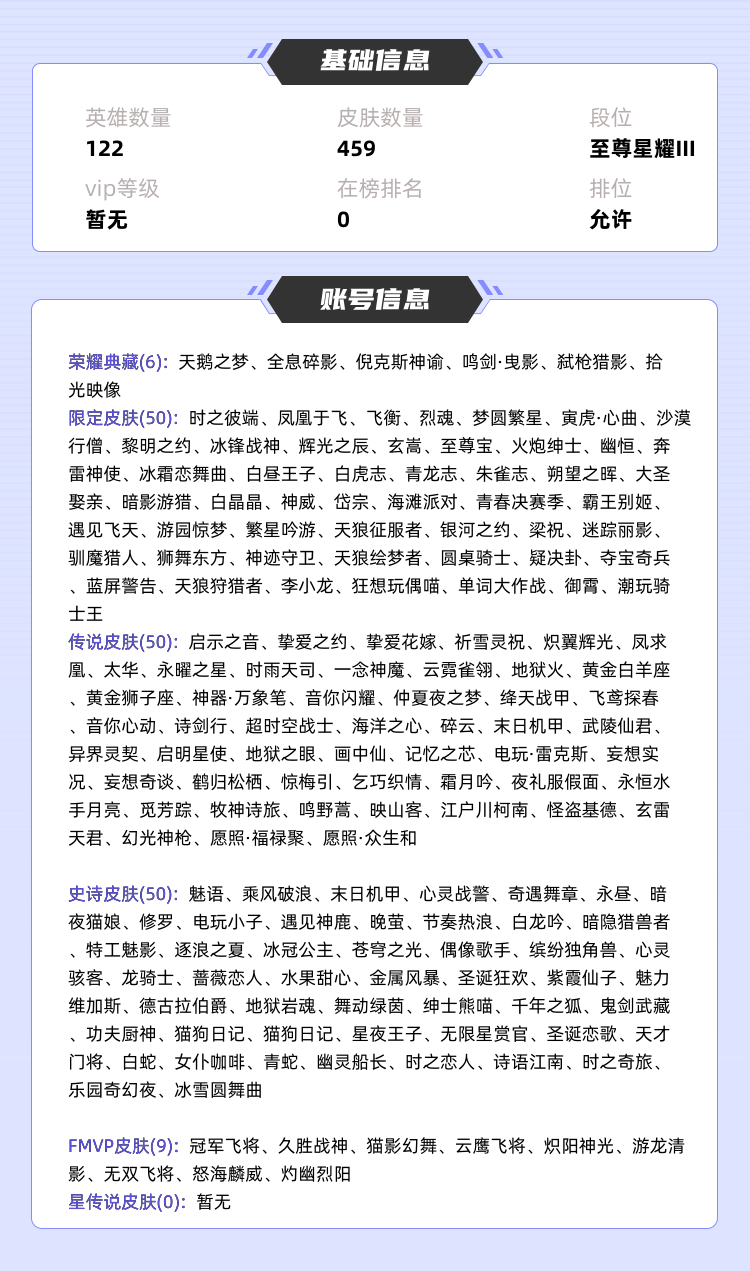 装备描述:>>>>>>毁号,涉及毁坏虚拟财产罪及计算机安全罪,请文明游戏素质游戏,让我们共建美好租号平台>>>>>> 本游戏账号: ,基础段位:至尊星耀III,英雄多,皮肤多。典藏皮肤6个,感受典藏皮肤带来的优质体验快感,FMVP皮肤9个,尽情享受FMVP皮肤带来的主角光环, 私人所属英雄皮肤有:瑶 拾光映像||小乔 天鹅之梦||武则天 倪克斯神谕||李白 鸣剑·曳影||韩信 弑枪猎影||孙悟空 全息碎影司空震 愿照·山河定||女娲 愿照·千秋盛||虞姬 愿照·岁时盈||蔡文姬 愿照·福禄聚||云缨 幻光神枪||妲己 愿照·众生和||王昭君 映山客||澜 愿照·九州拓||嬴政 玄雷天君||鲁班七号 江户川柯南||马可波罗 怪盗基德||桑启 鸣野蒿||庄周 牧神诗旅||伽罗 炽翼辉光||上官婉儿 神器·万象笔||露娜 霜月吟||艾琳 觅芳踪||狄仁杰 夜礼服假面||王昭君 永恒水手月亮||宫本武藏 惊梅引||王昭君 乞巧织情||公孙离 记忆之芯||李元芳 飞鸢探春||澜 电玩·雷克斯||小乔 音你心动||孙尚香 音你闪耀||狄仁杰 超时空战士||马可波罗 妄想实况||上官婉儿 妄想奇谈||云缨 鹤