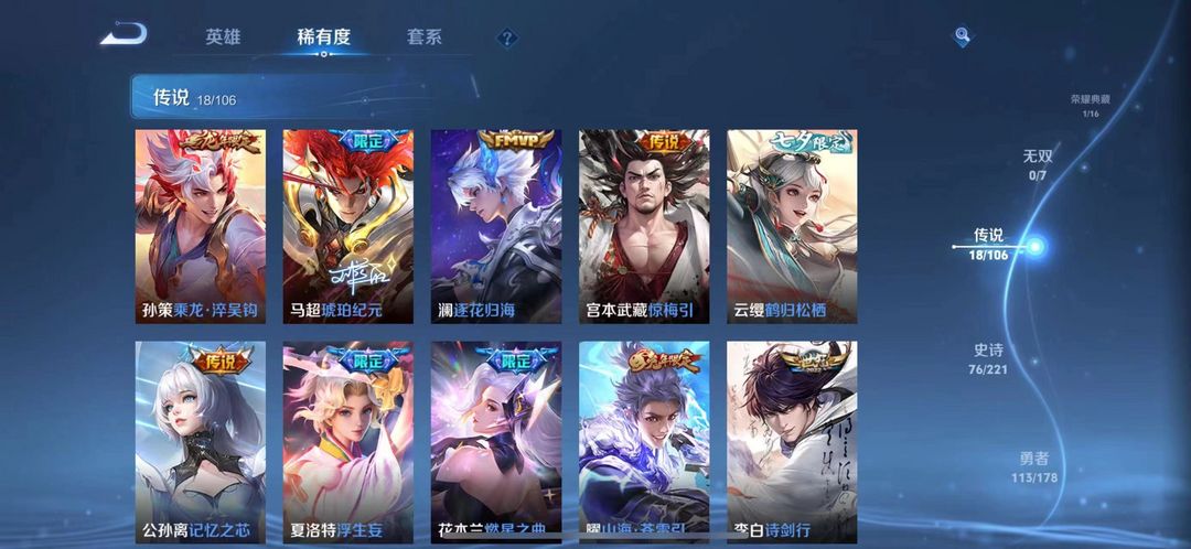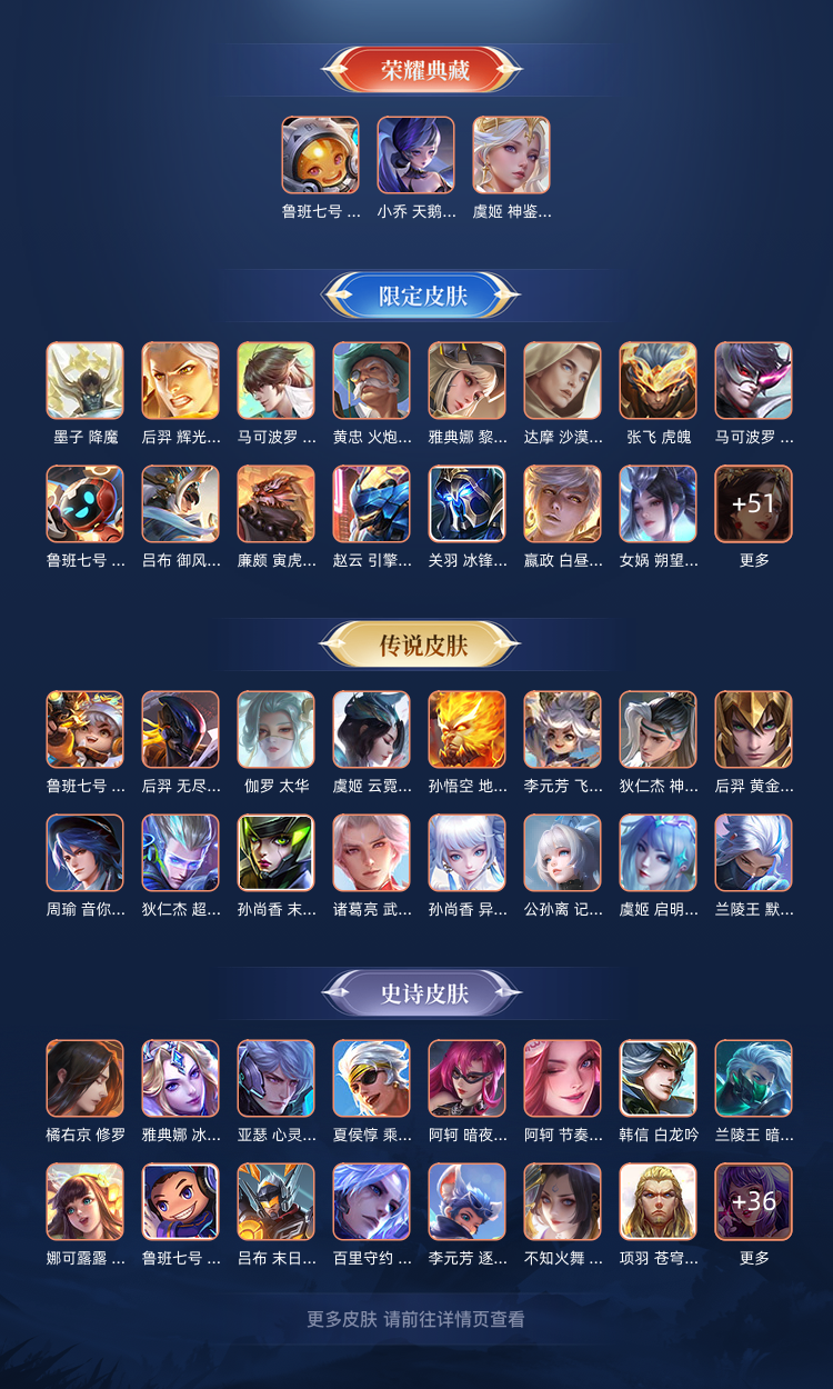 装备描述:英雄:虞姬(虞姬 神鉴启示录,虞姬 云霓雀翎,虞姬 无限倾心,虞姬 启明星使,虞姬 霸王别姬,虞姬 加勒比小姐,虞姬 凯尔特女王,区标);马可波罗(马可波罗 山海·玄木吟,马可波罗 暗影游猎,马可波罗 激情绿茵);狄仁杰(狄仁杰 神器·狴犴令,狄仁杰 超时空战士,狄仁杰 万华元夜,狄仁杰 鹰眼统帅,狄仁杰 锦衣卫,狄仁杰 魔术师,狄仁杰 阴阳师,区标);吕布(吕布 遇见神鼓,吕布 御风骁将,吕布 末日机甲,吕布 野性能量,吕布 猎兽之王,吕布 圣诞狂欢);孙尚香(孙尚香 时之恋人,孙尚香 末日机甲,孙尚香 沉稳之力,孙尚香 异界灵契,孙尚香 蔷薇恋人,孙尚香 水果甜心);孙悟空(孙悟空 地狱火,孙悟空 美猴王,孙悟空 大圣娶亲,孙悟空 西部大镖客);鲁班七号(鲁班七号 时之奇旅,鲁班七号 寅虎·瑞焰,鲁班七号 乒乒小将