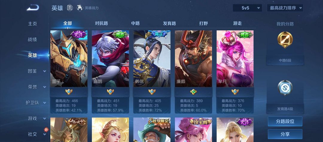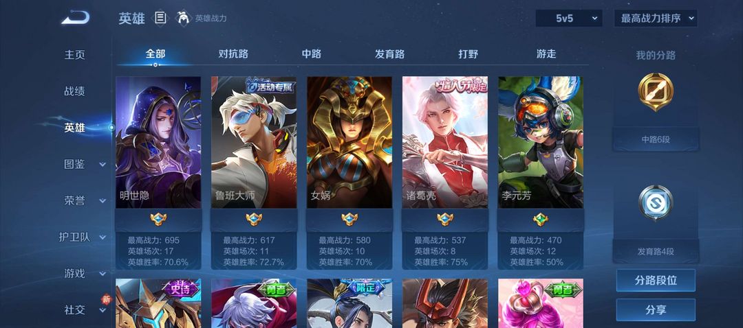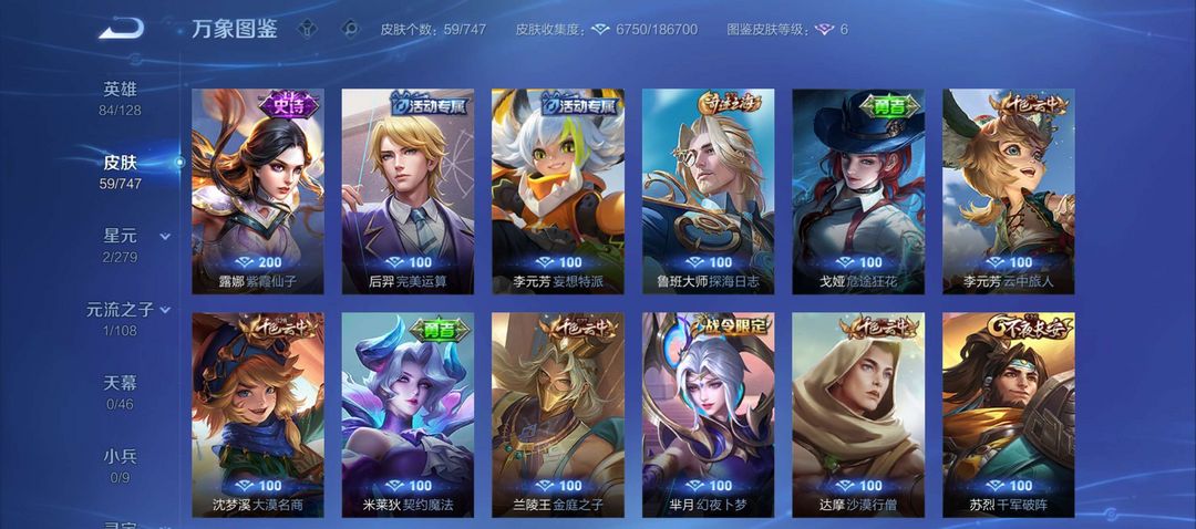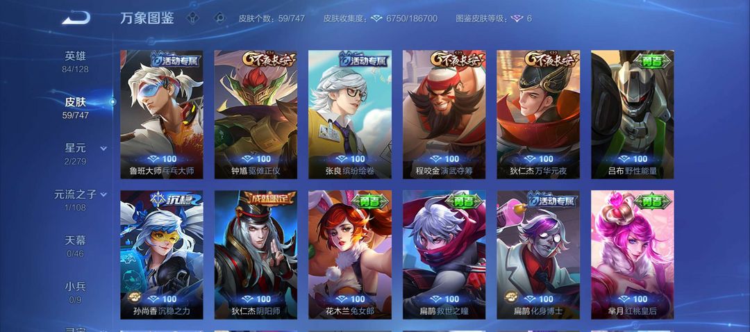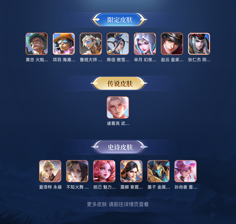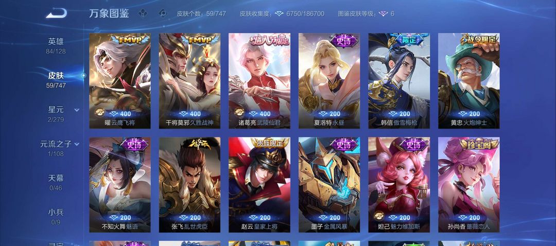 诸葛亮武陵仙君,韩信傲雪梅枪,干将FMVP,耀FMVP,59皮肤接近满铭文。