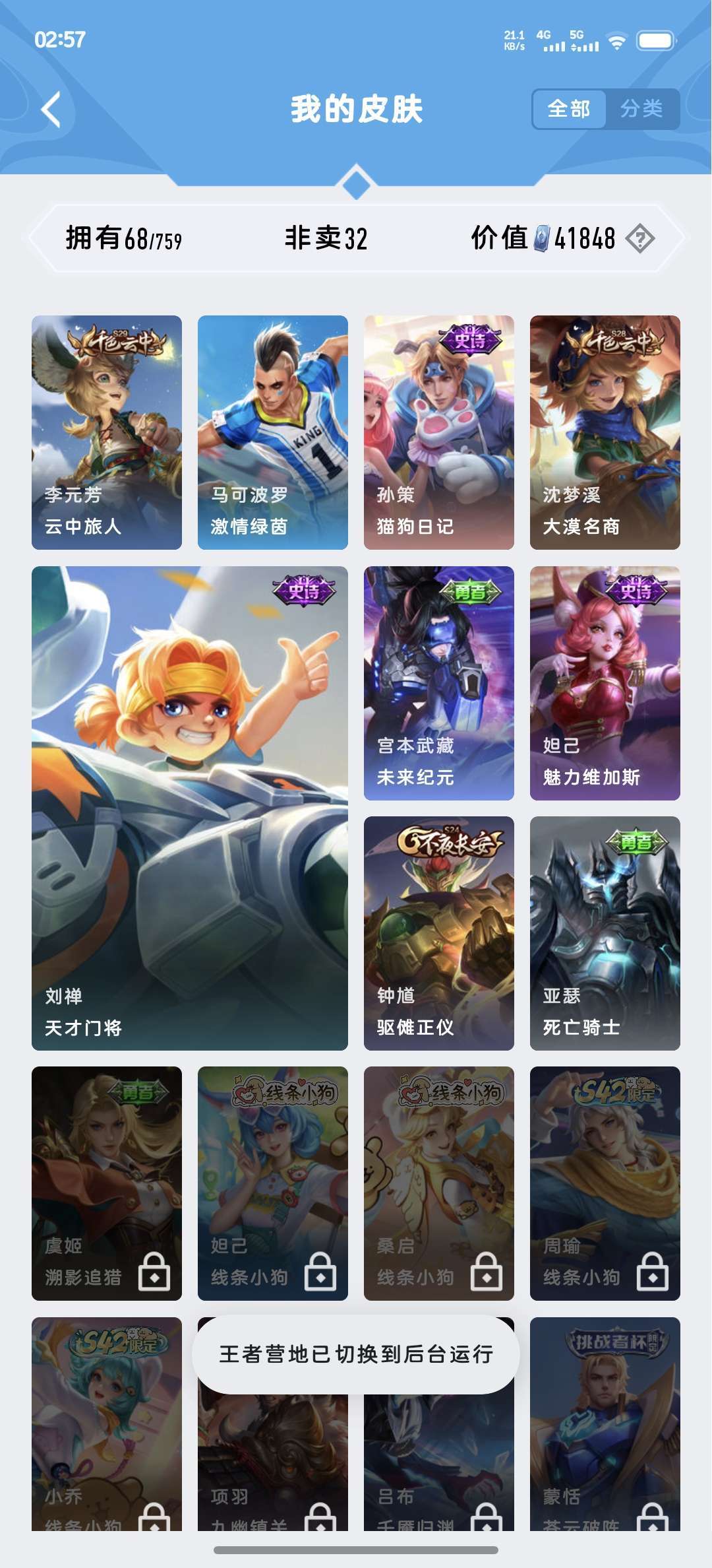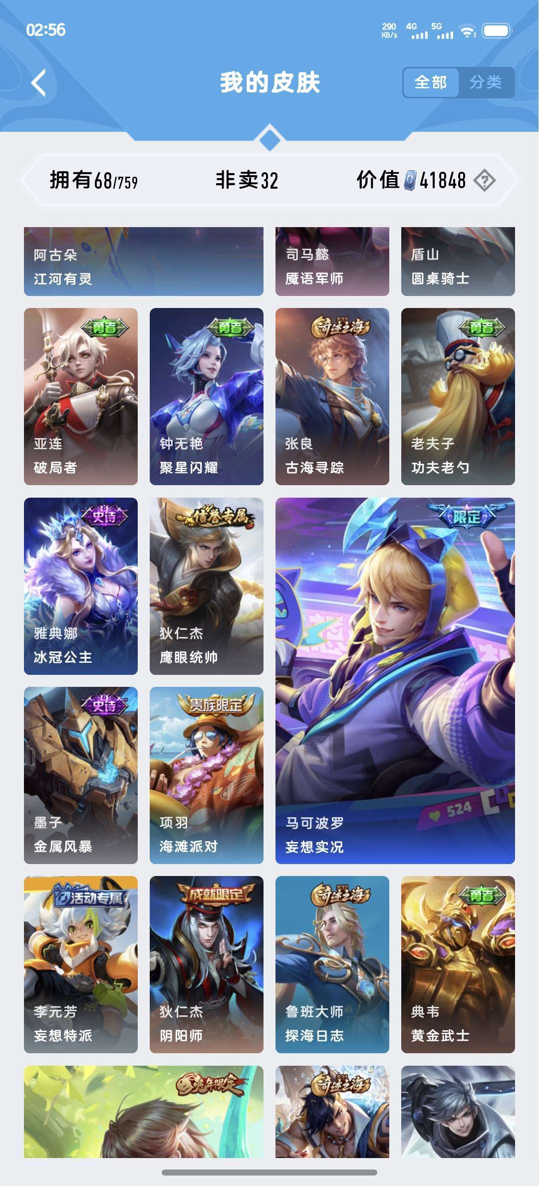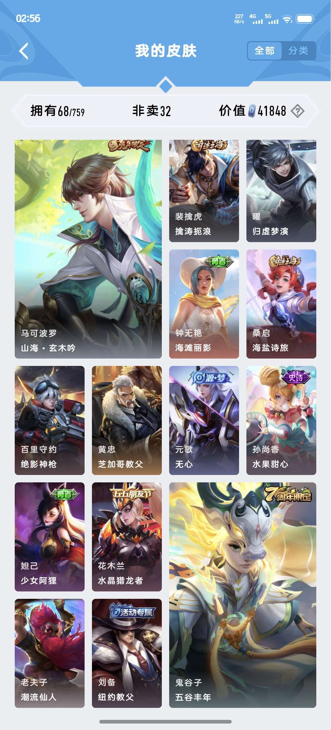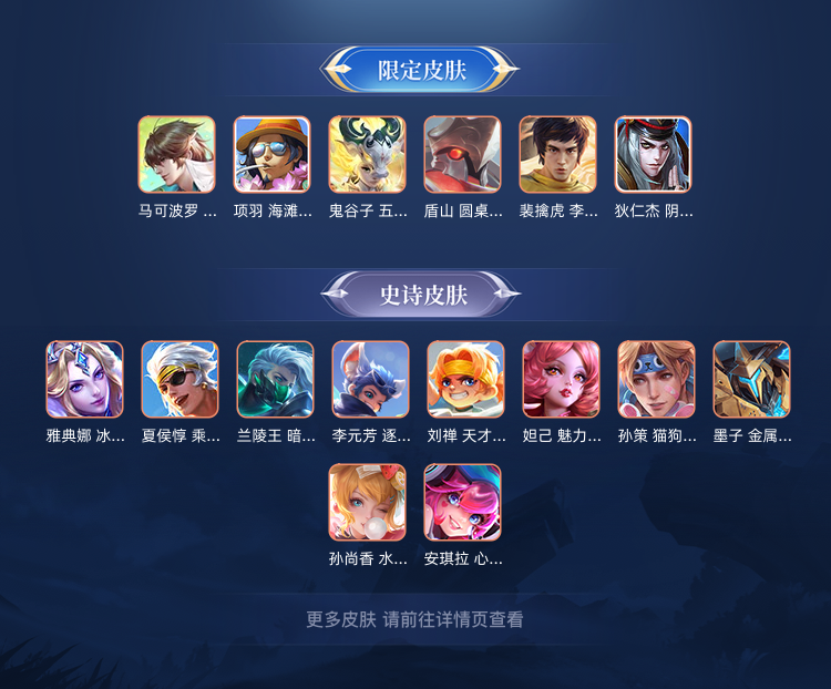 归墟梦演皮肤2周年限定皮肤3西部皮肤1夏日海滩皮肤6五环荣耀皮肤1活动专属皮肤9赛季限定皮肤10