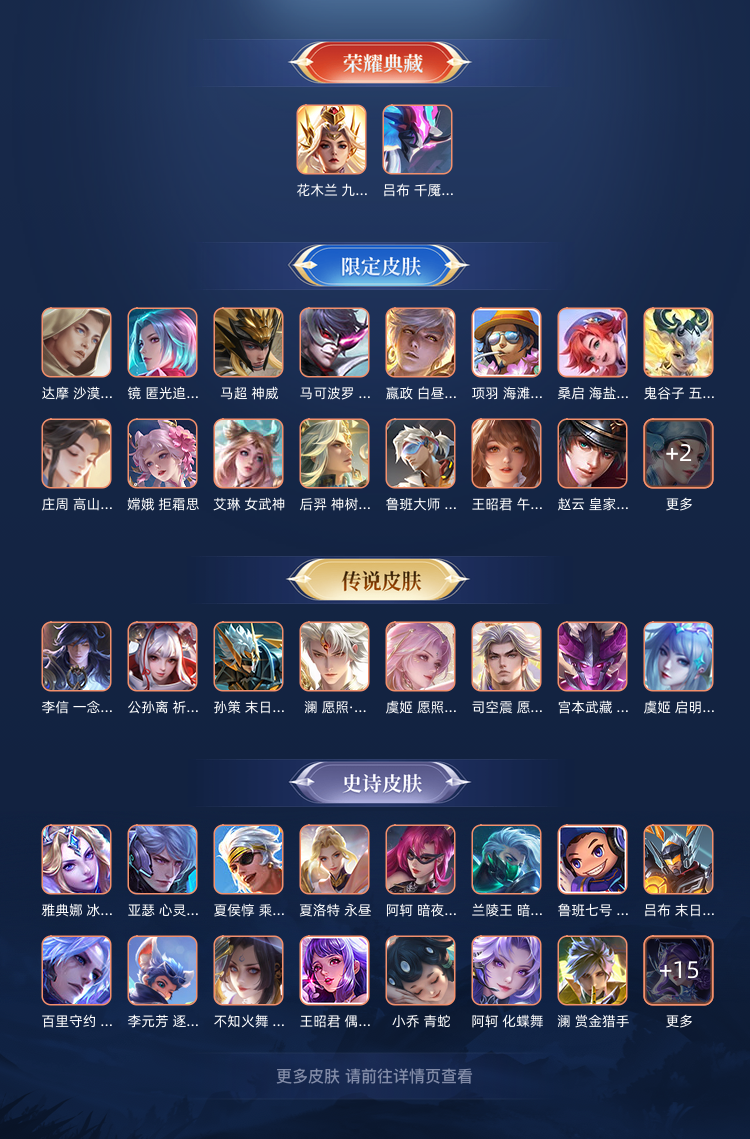 市标花木兰。两个典藏(吕布花木兰)一个无双(耀)还有珍品以及热门传说皮肤马超镜司空震全皮肤