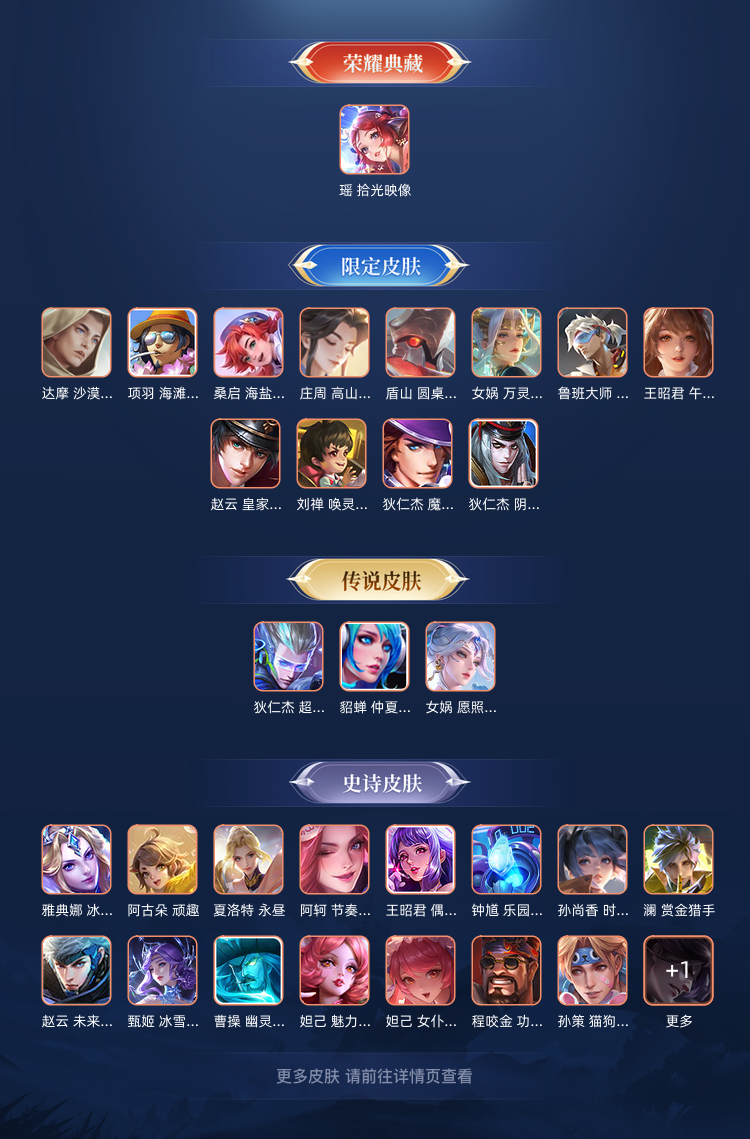 装备描述:瑶典藏,朵利亚传说皮,镜、耀、公孙离、王昭君FMVP,女娲蛇年