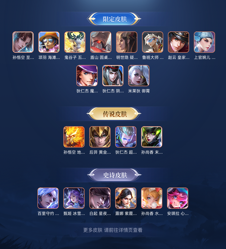 有至尊宝,地狱火,后羿限定皮肤,奕星限定皮肤,还有80多种皮肤任意玩,可排位