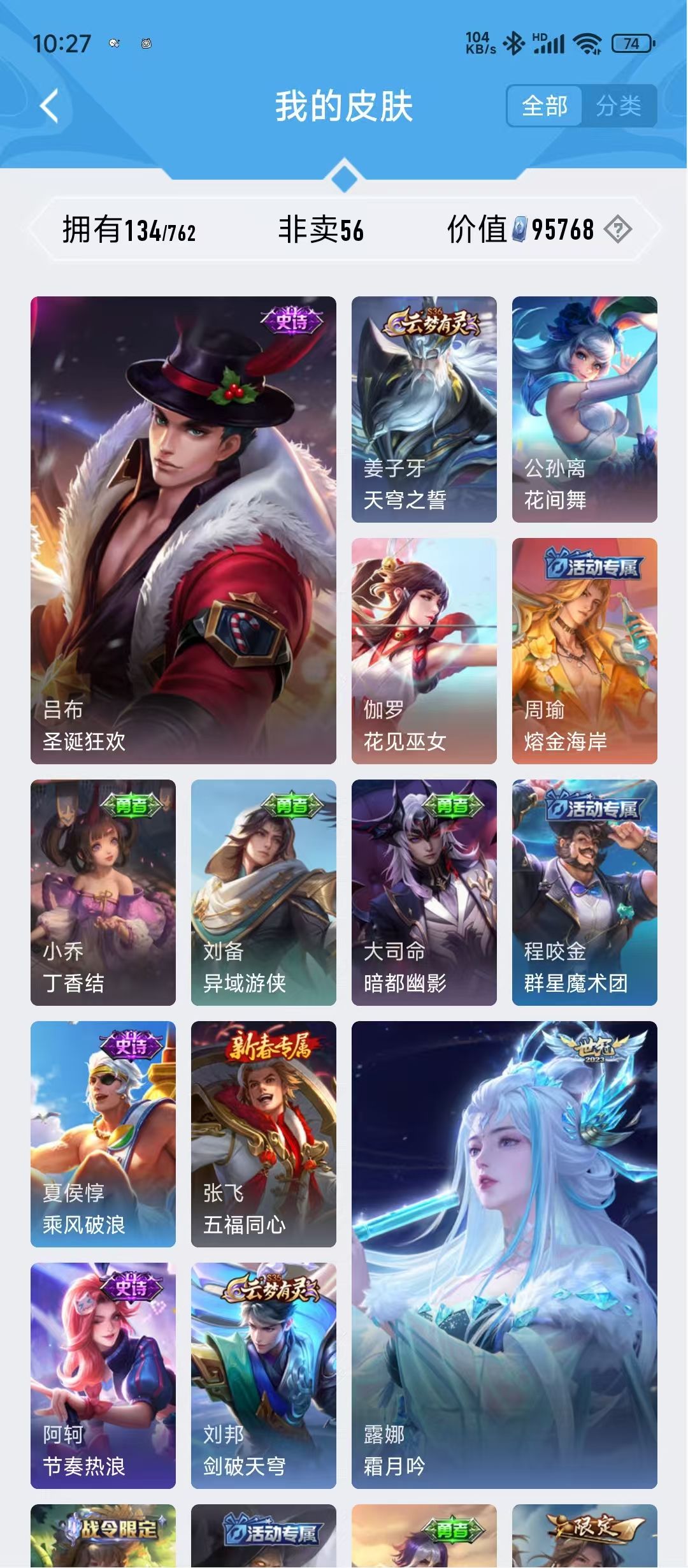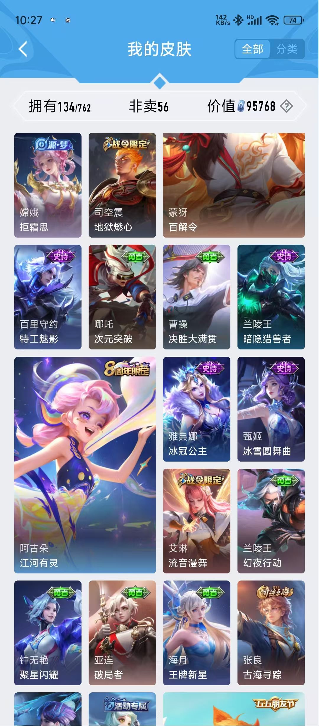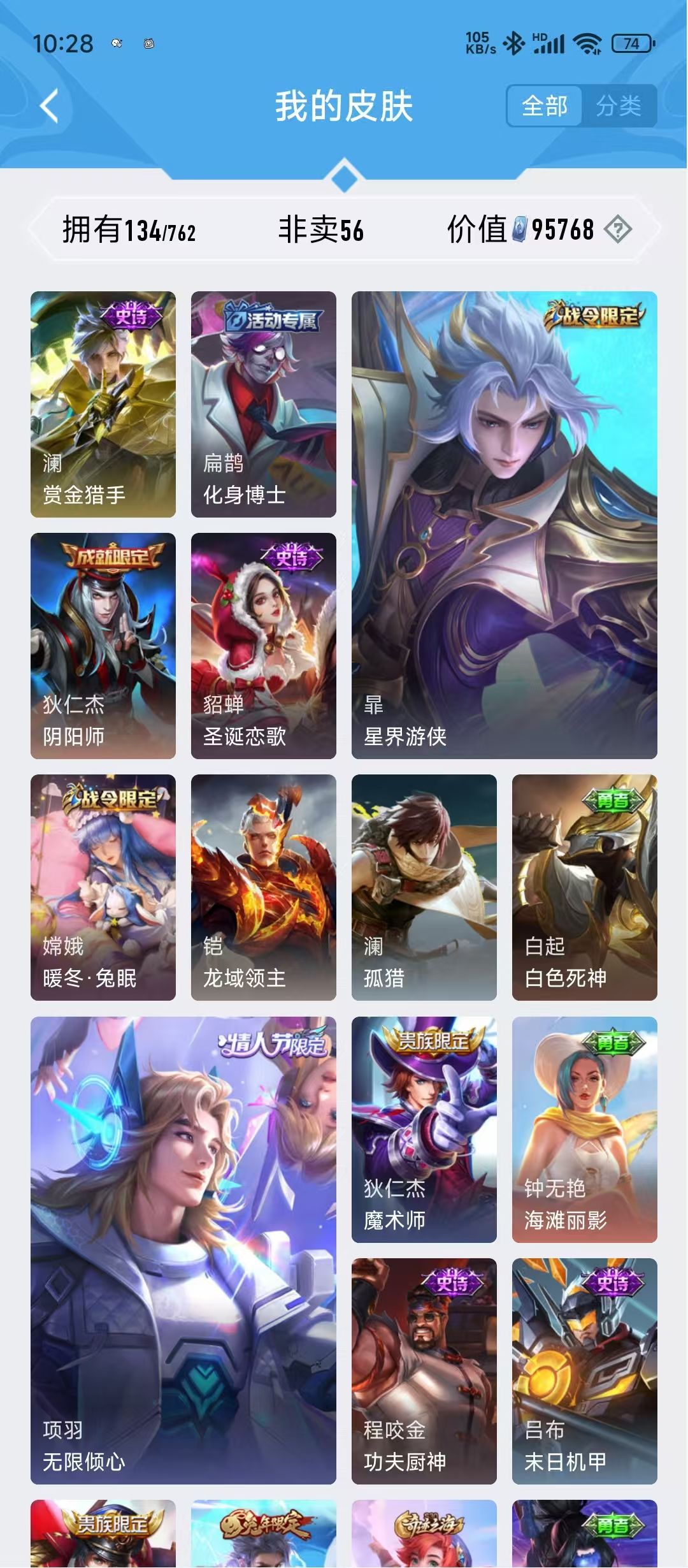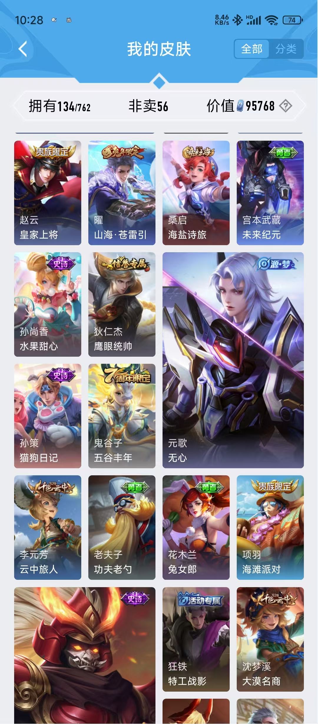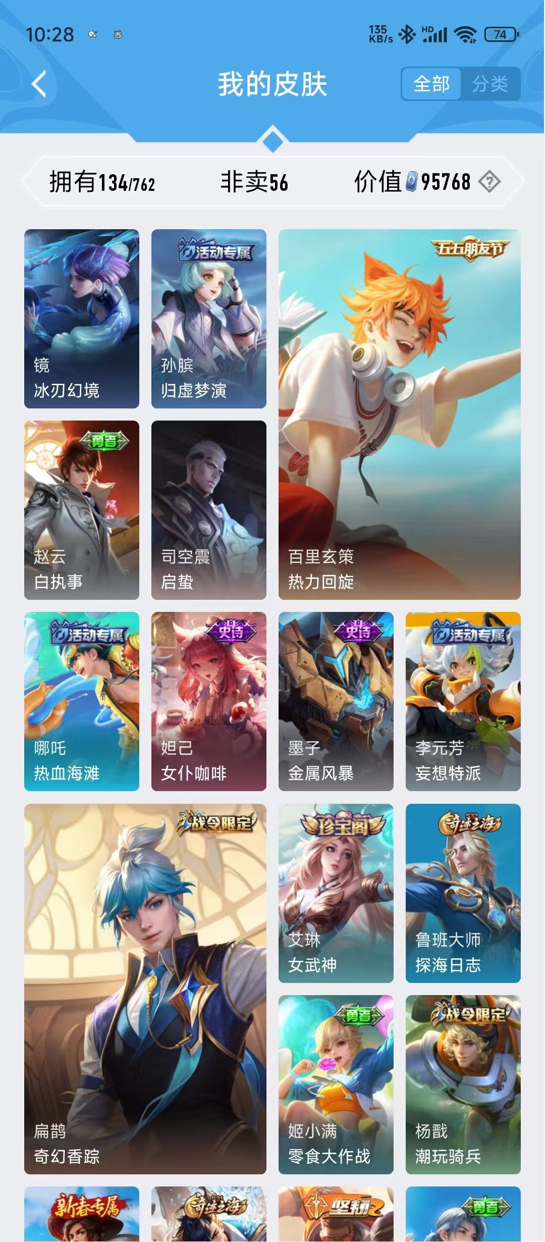 装备描述:134皮肤-李逍遥 貂蝉曦玄引 公孙离云诺千山 不知火舞魅语 露娜霜月吟 百里玄策热力回旋 项羽无限倾心