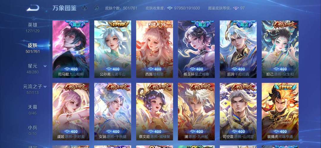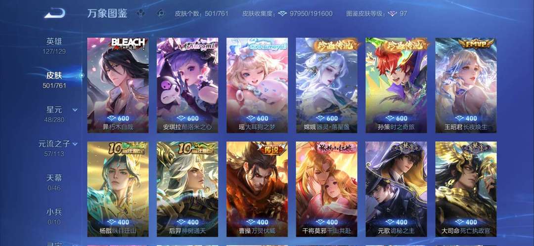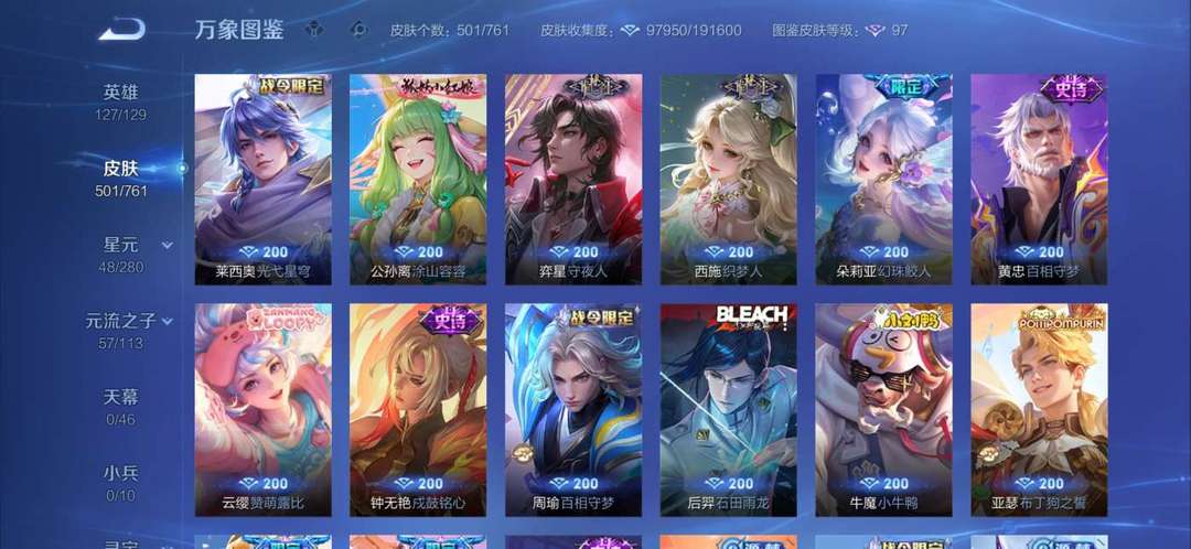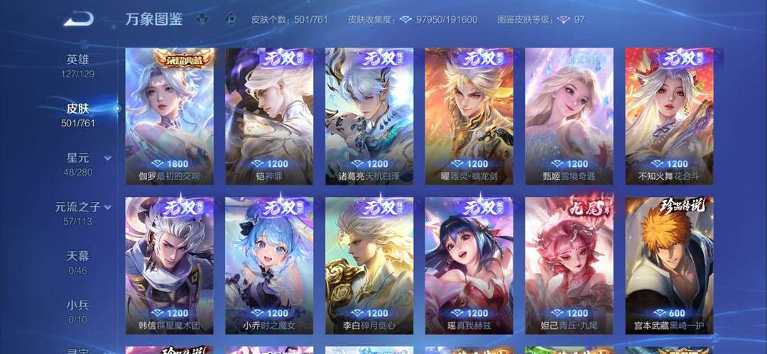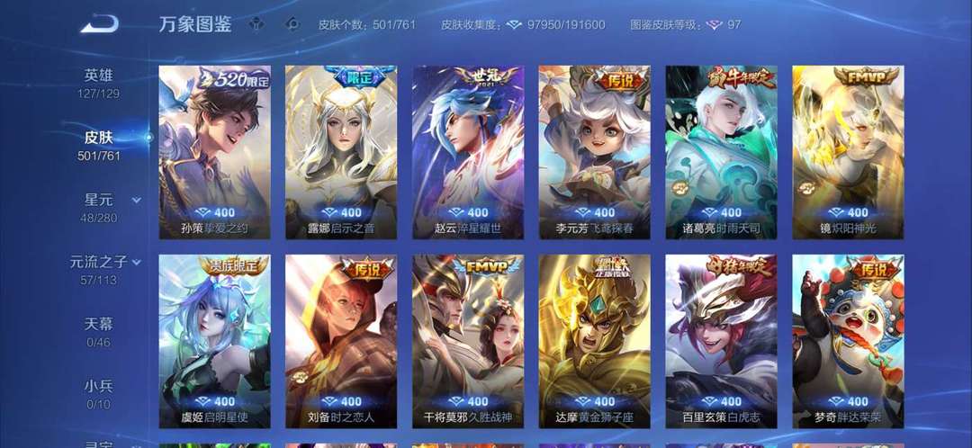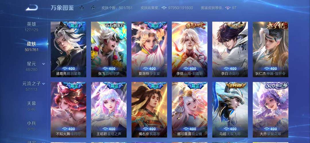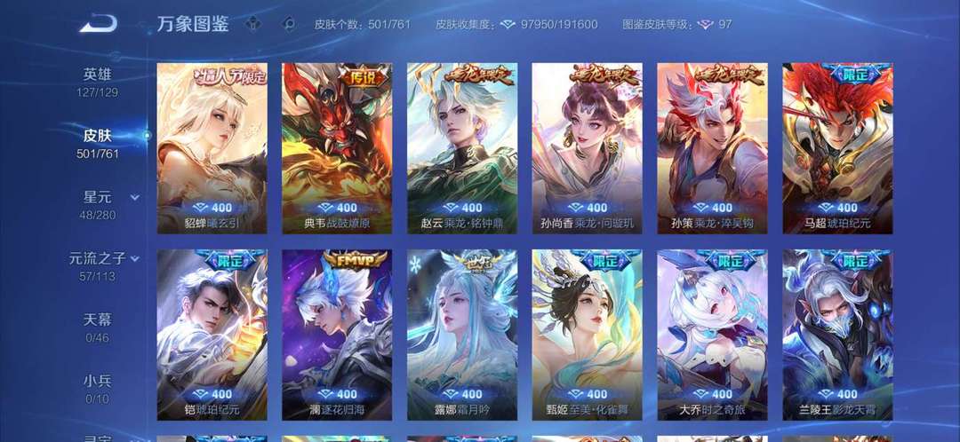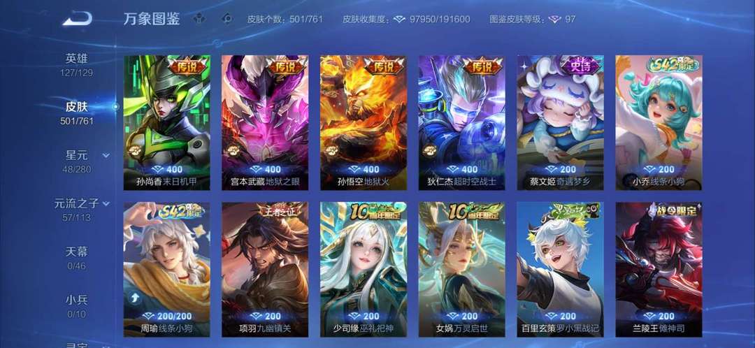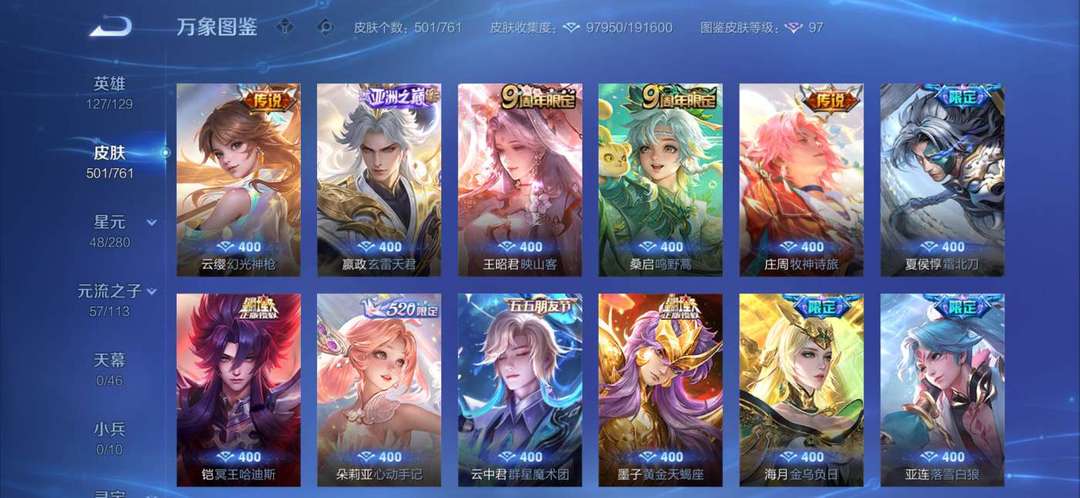苹果区143区v9 501个皮肤1个典藏10个无双71个传说大部分无双都有很多限定皮可打排位