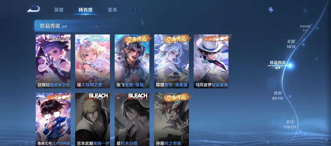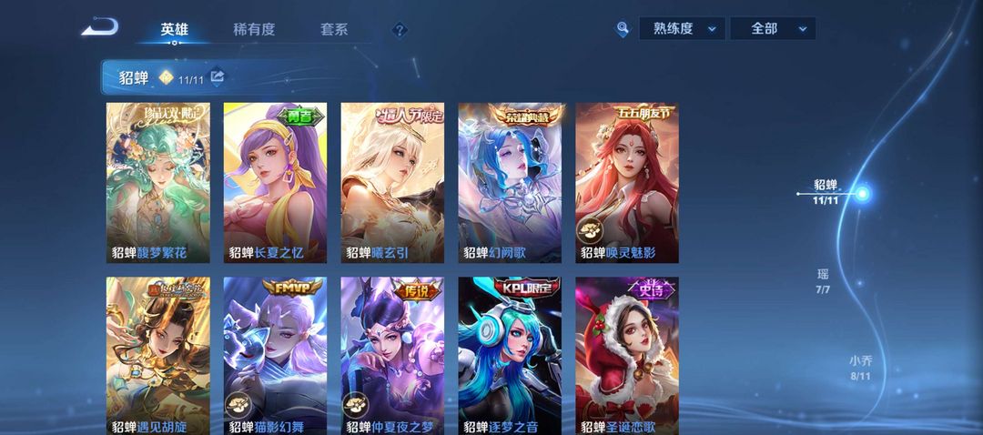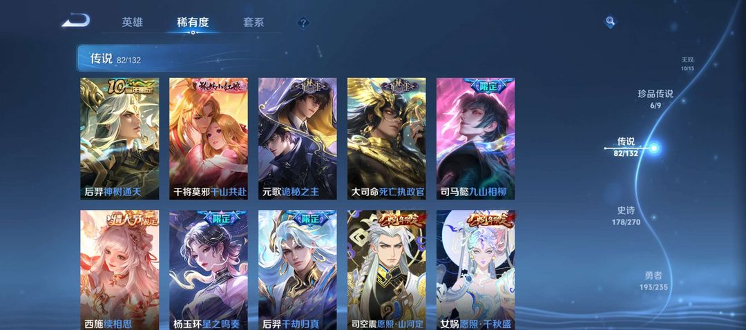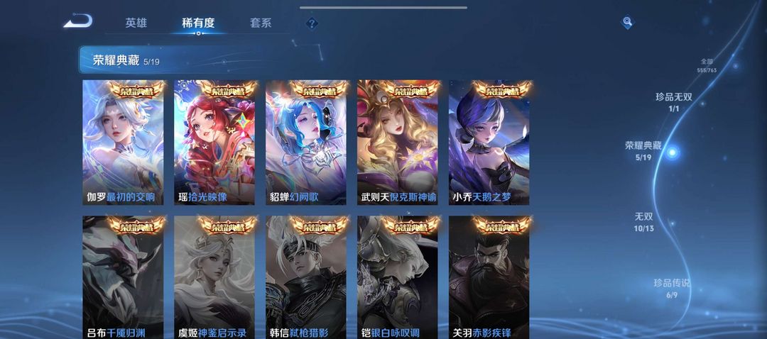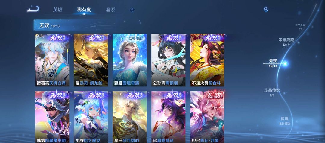 无双v10自用账号全英雄500+皮肤,大量无双典藏皮肤,貂蝉全皮肤。历史百星王者,满铭文