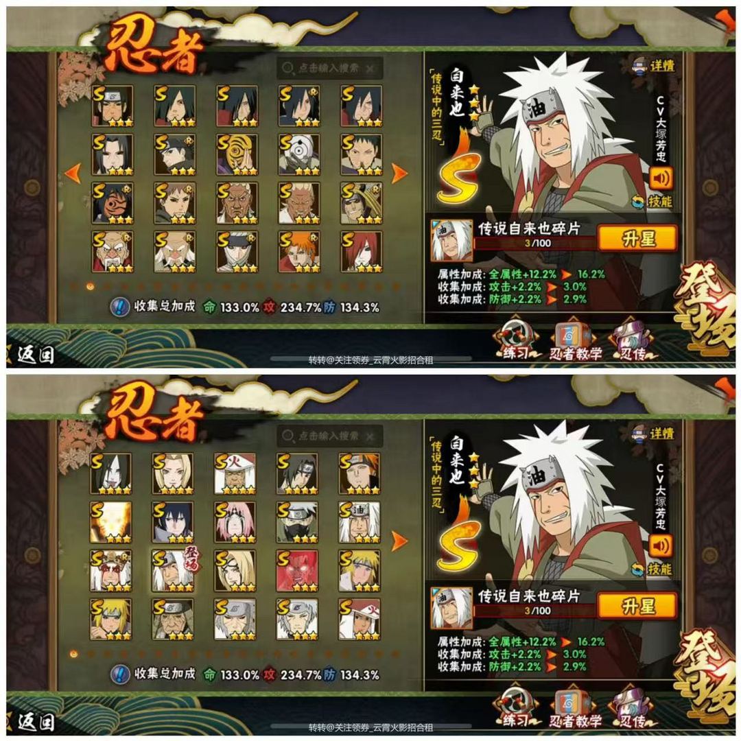 限制: 租号1次及以上 |装备描述:2000万/44s60A✨六尾鸣人✨漂泊带土/秽土再不斩✨传说自来也 神农 通灵熊猫 漂泊佩恩 秽土角都 绯流琥蝎 新春水门 泳装南 新春鼬 漂泊二代 惊门凯 暴怒带土 温馨提示:此账号为快速.上号模式登录,不需要输入账号密码,租用后- -键登录即可,如果出现登录异常等无法登录情况,只需要先打开游戏到登录界面,然后在用租号玩一键登录即可。 安全提示:恶意撤单或者恶意投诉差评将永久拉黑处理,请文明游戏 小店在这祝您游戏愉快,喜欢的点击收藏 点券忍者出啥秒啥!