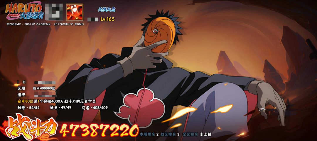4744万战✨属攻2786✨五影会谈斑✨九喇嘛水门✨全忍者✨全通灵✨全时装✨传承奥义✨兔龙蛇年替身