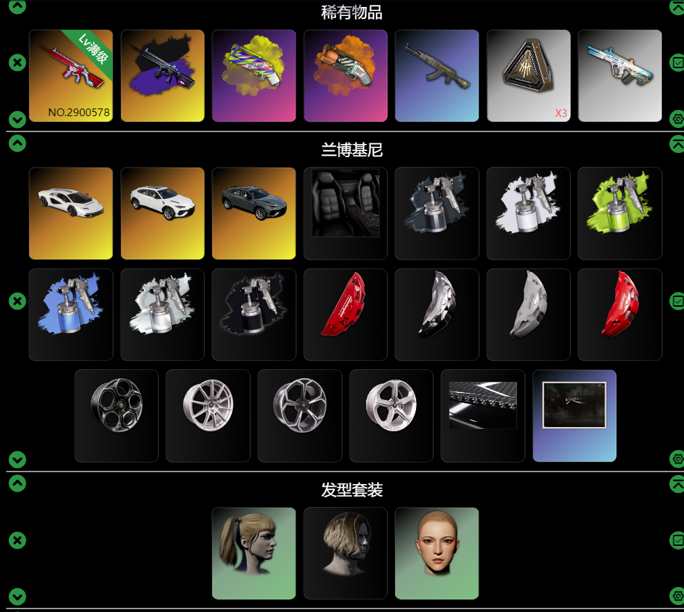 装备描述:---家里不要租 家里电脑玩不了--- 保时捷911/满兰博基尼有大厅/满级异色无信号M416有淘汰特效/爆裂AUG/妖魔之触-AVE32/时光加农sks/拉风龙全套大礼包/白色滑雪镜/金色M762/绷带AKM/无信号S12K/亚特兰AUG/猎手SKS/猛虎SLR/双烟枪/无慈悲98K/无慈悲K2/波浪头/双马尾/丸子头/朱莉头/花臂/发光套等大量皮肤套装