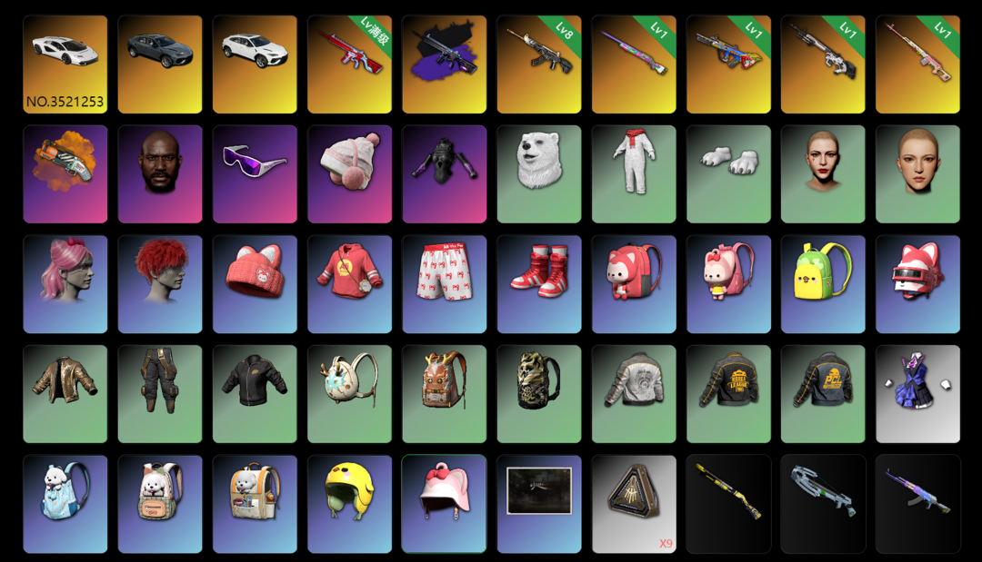 装备描述:---家里不要租 家里电脑玩不了--- 【7神器】满兰博基尼✨满级异色无信号M416✨八级恶魔ACE✨美杜莎M762✨彩虹M24✨爆裂AUG✨赛搏MK12✨粉梦德拉贡✨烟枪✨阿狸大礼包✨拉风龙大礼包✨牛角✨黑鬼✨熊脚✨滑雪镜✨滑雪帽✨发光套✨魔力甜心✨大量皮肤套装✨10级无信号M416✨10级M416✨满级M416✨8级恶魔ACE跟10级恶魔ACE外观一致都是高级皮肤外观✨