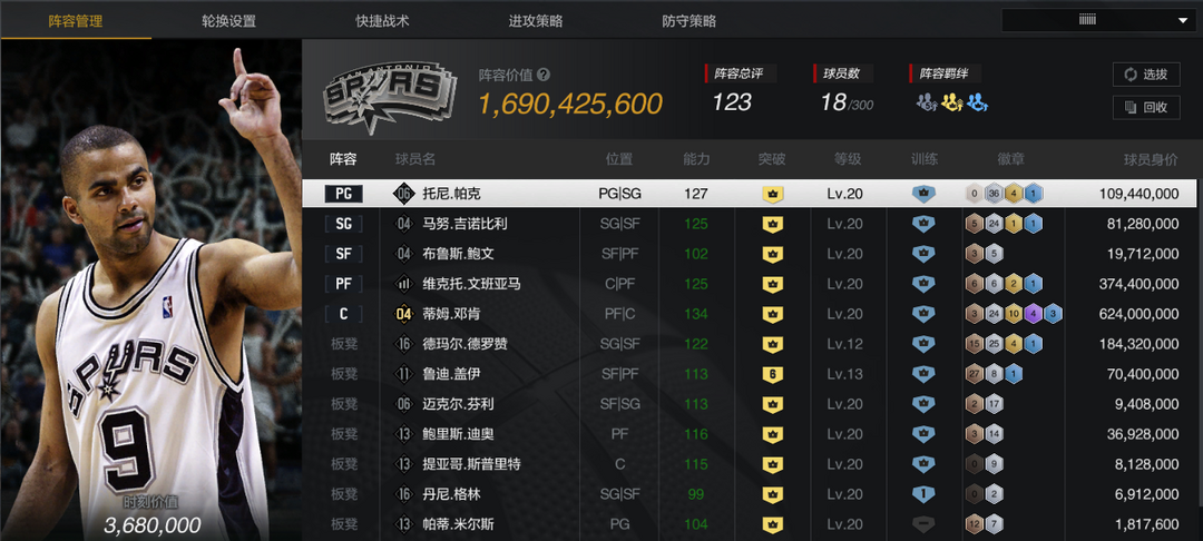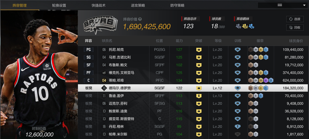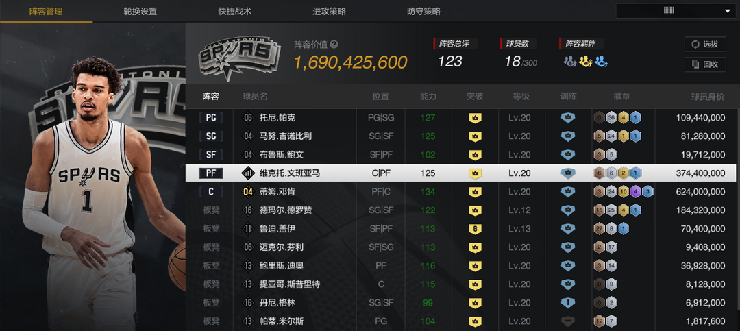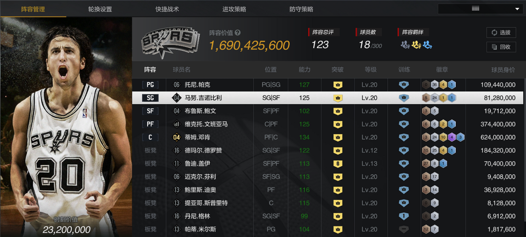 装备描述:【巅峰马刺套】【10双时刻邓肯】【10文班】【10时刻德罗赞/帕克/妖刀】【10迪奥/鲍文/6盖伊】