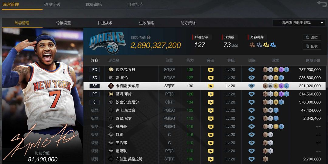 限制: 撤单率<70%才可租用此帐号装备描述:10突三时刻95乔丹全能巨星紫徽章♥10突小时刻奥尼尔♥东契奇姚明龙之队!租完可以收藏下给个文字评价谢谢支持!信誉积分系统出来了还请各位租号的老板注意自己的出租时间谢谢合作! 本账号租用期间游戏内禁止事项(租客若违反轻则拉黑,情节严重的必定会追究其法律责任): 1.禁止退出俱乐部。 2.禁止使用账号内的游戏币(合同费),点券,月券,购物券等所有货币。 3.禁止对账户内的所有球星进行各种形式的购买,出售,分解,重置等级或幸运突破,以及其他恶意破坏行为。 4.禁止恶意退出进行中的游戏,恶意掉信誉分 5.禁止在游戏内