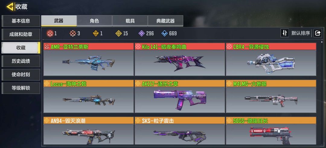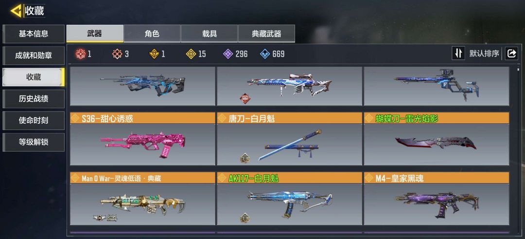 装备描述:神话:亚特兰蒂斯,141,cbr4 传说:AK117,动能,海神,唐刀,老母鸡,50白虎等等